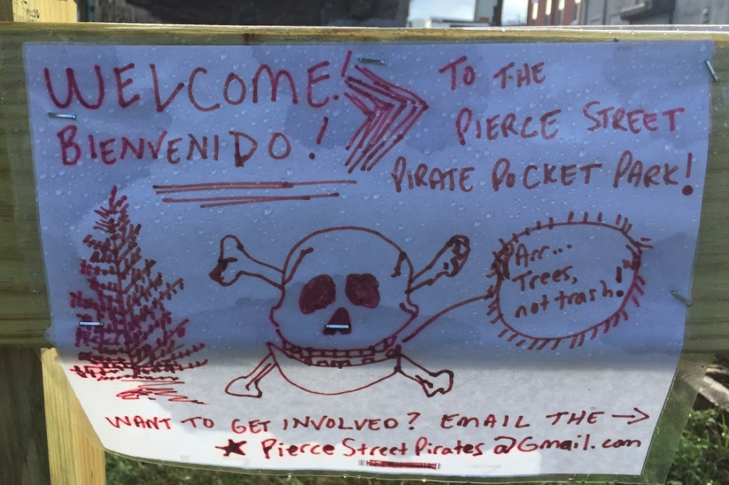 It’s amazing how many people came by and expressed appreciation and the willingness to pitch in … the lot seemed like a force for community. We just need a nice neutral space to gather, and, as mentioned in the article, show movies. We also made the Pierce Street Pirate Park page to share updates.